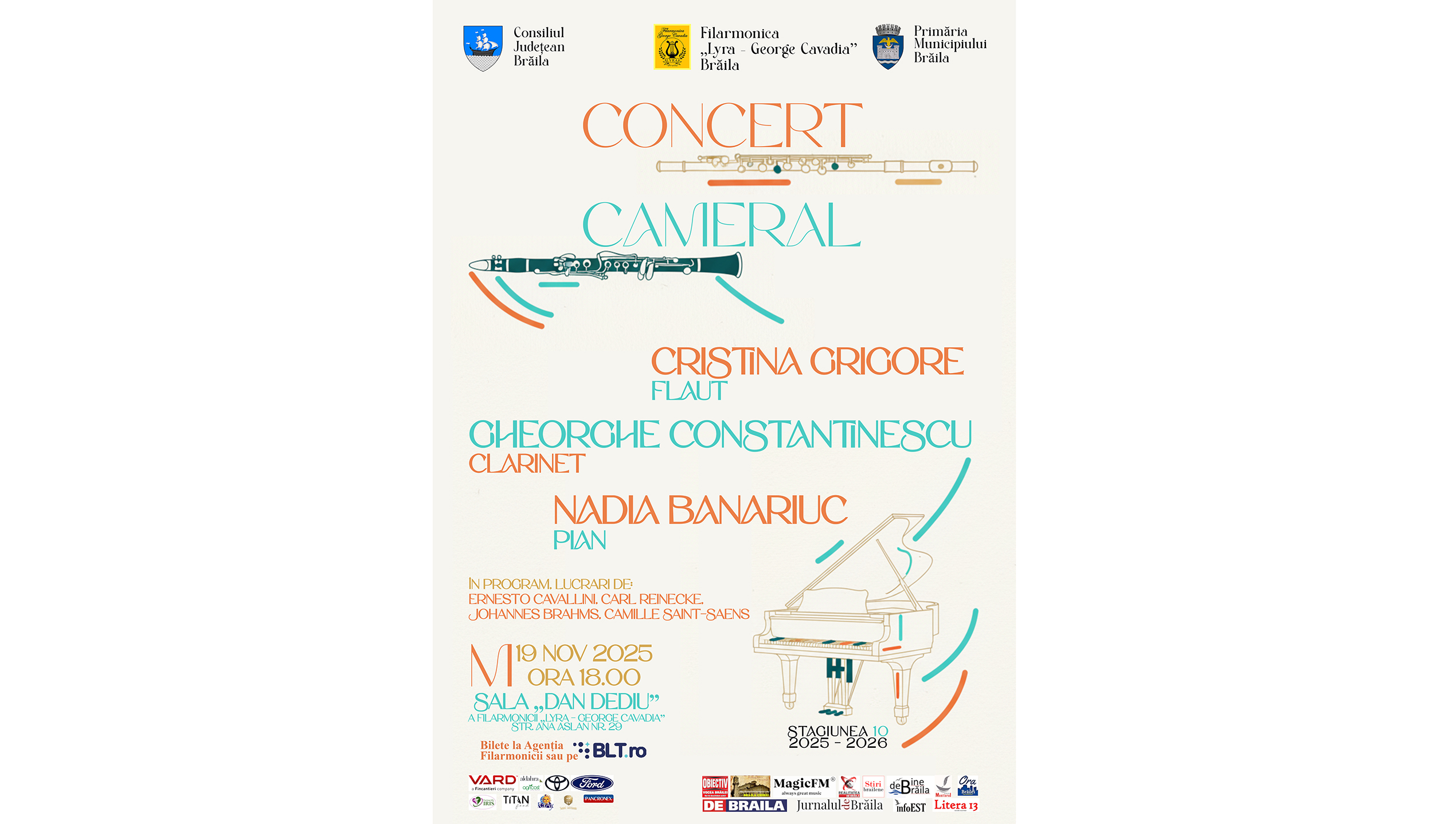 Filarmonica „Lyra – George Cavadia” din Brăila organizează miercuri, 19 noiembrie 2025, de la ora 18:00, un concert cameral în Sala „Dan Dediu”. Evenimentul reunește artiștii Cristina Grigore la flaut, Gheorghe Constantinescu la clarinet și Nadia Banariuc la pian pentru un dialog muzical rafinat.