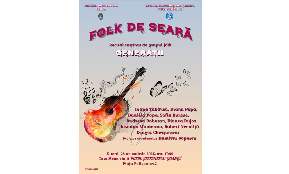 „Într-o toamnă blândă, când frunzele murmură povești vechi pe aleile Brăilei, Centrul Cultural și de Agrement «Chira Chiralina» vă invită să deschideți larg porțile sufletului și să pășiți, vineri, 24 octombrie 2025, de la ora 17:00, în lumea caldă a muzicii folk”, a declarat managerul centrului, Emanoil Ciucașu, care va gazdui astfel un moment armonios dedicat iubitorilor de muzică.