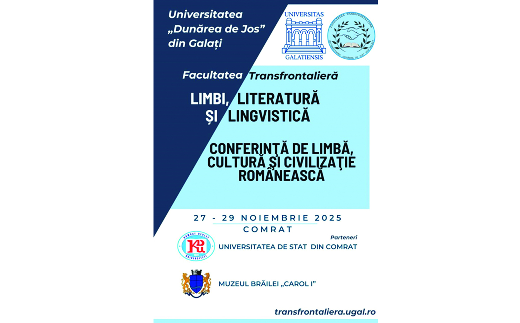 Facultatea Transfrontalieră a Universității „Dunărea de Jos” din Galați organizează, între 27 și 29 noiembrie 2025, conferința „Limbi, literatură şi lingvistică - Conferinţă de limbă, cultură şi civilizaţie românească”. Evenimentul se desfășoară în parteneriat cu Universitatea de Stat din Comrat și Muzeul Brăilei „Carol I”.