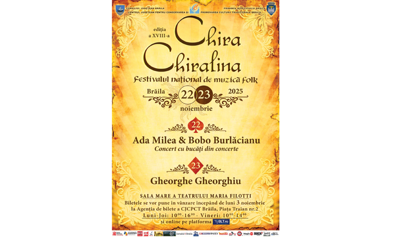 Cel de-al XVIII-lea Festival Național de Muzică Folk „Chira Chiralina” se va desfășura în Sala Mare a Teatrului „Maria Filotti” din Brăila în zilele de 22 și 23 noiembrie. Evenimentul este organizat de Consiliul Județean Brăila și Primăria Municipiului Brăila. Pregătirile au intrat acum în faza finală.