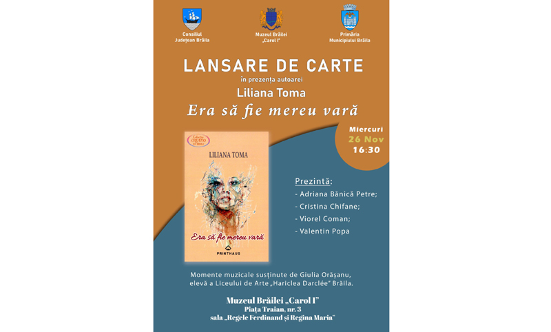 Muzeul Brăilei „Carol I” organizează miercuri, 26 noiembrie, de la ora 16:30, la Sala „Regele Ferdinand I și Regina Maria”, lansarea romanului „Era să fie mereu vară”. Evenimentul va avea loc în sediul din Piața Traian nr. 3 și îl prezintă pe un grup de oameni de cultură din Brăila.
