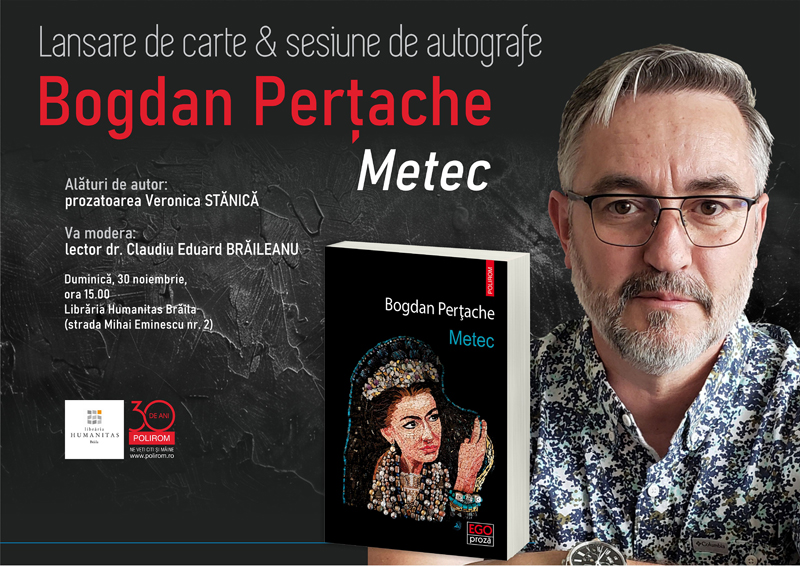 Pe 30 noiembrie, de la ora 15.00, Bogdan Perțache își va prezenta noul roman „Metec” la Librăria Humanitas din centrul istoric al municipiului Brăila. Evenimentul va include un dialog între autor și prozatoarea Veronica Stănică, fiind moderat de dr. Claudiu Eduard Brăileanu, lector la Universitatea „Dunărea de Jos” din Galați.