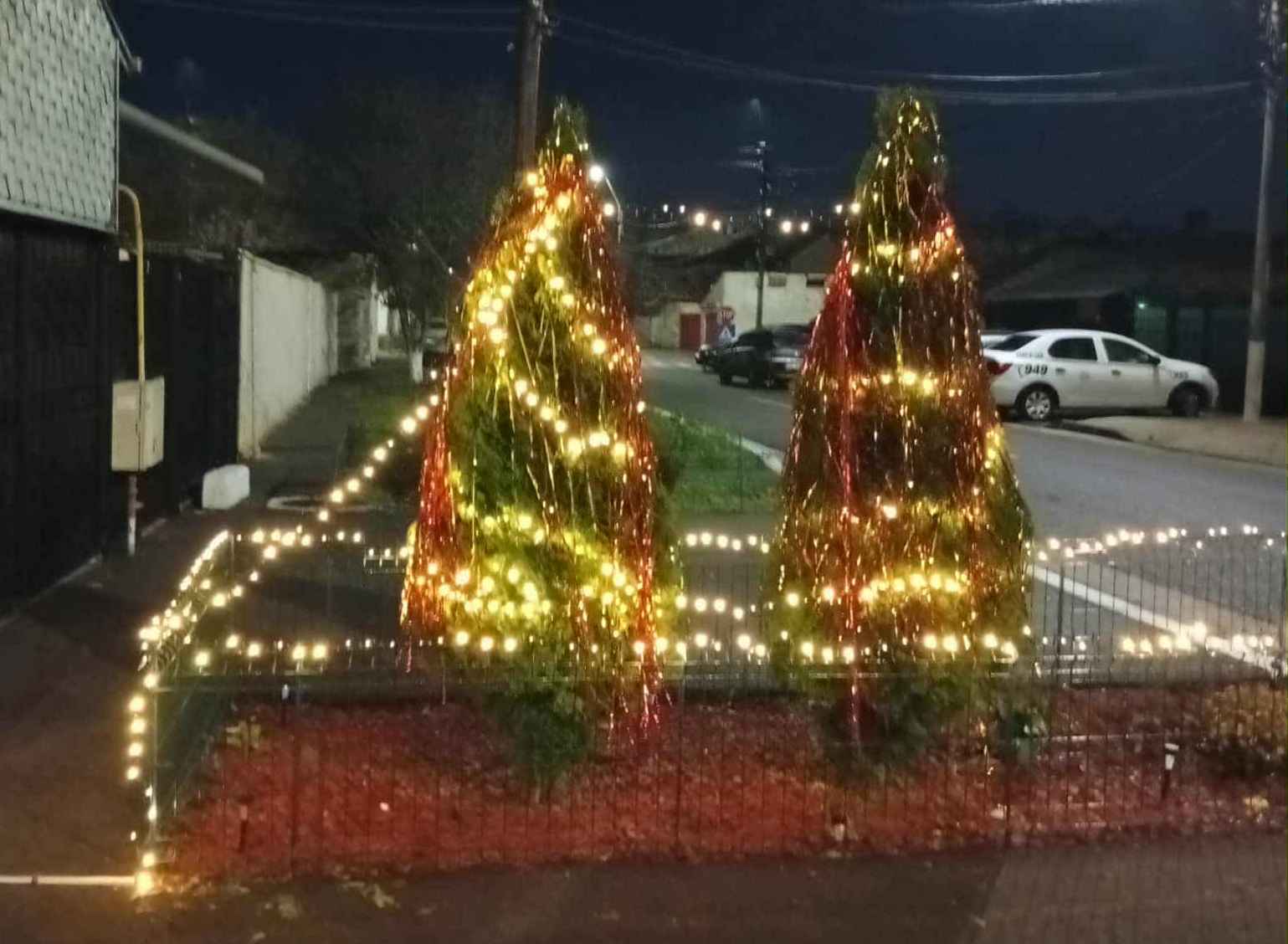 Pe strada Grindului din cartierul Vidin, un mic colț de sărbătoare a devenit punct de atracție pentru trecători. Doi arbori tuia decorați cu beteală și lumini multicolore sunt așezați la poartă, invitând oamenii să se oprească și să își facă fotografii în zonă, ziua și seara.