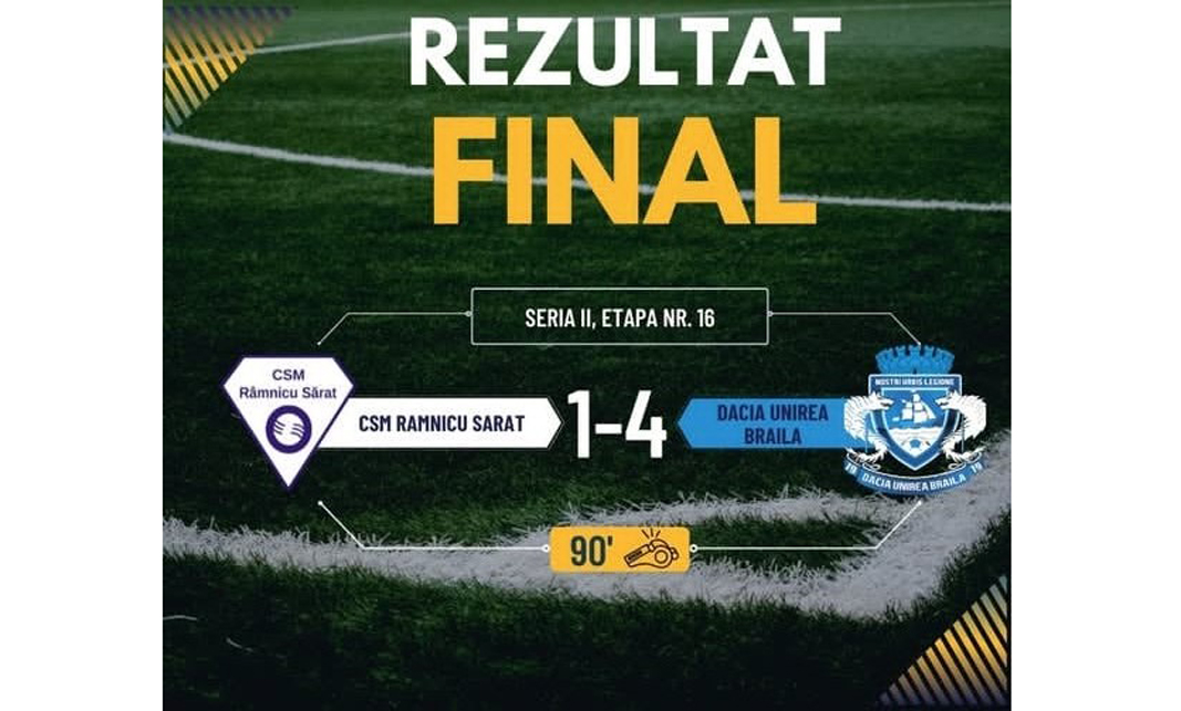 Dacia Unirea Brăila a obținut a patra victorie în acest sezon, învingând în deplasare CSM Râmnicu Sărat cu scorul de 4-1, în etapa a 16-a a Seriei a II-a din Liga a III-a. Partida a fost echilibrată până aproape de final, iar formația brăileană a impus ritmul în ultimele zece minute.